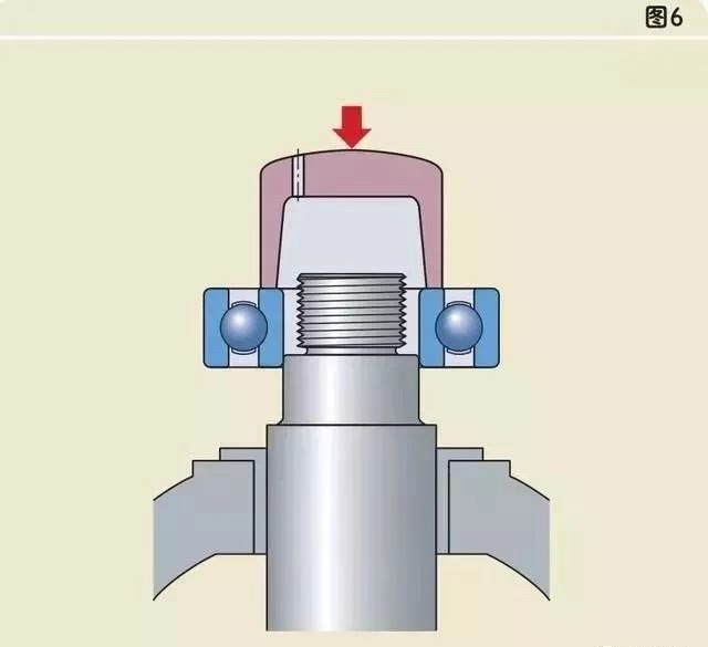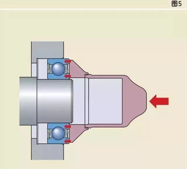 安裝內(nèi)圈(或外圈)過(guò)盈配合的軸承,禁止用鐵錘直接敲擊軸承內(nèi)圈(或外圈)端面,這樣很容易把擋邊敲壞。應(yīng)該采用套筒放在內(nèi)圈(或外圈)端面上,用鐵錘敲擊套筒來(lái)安裝。